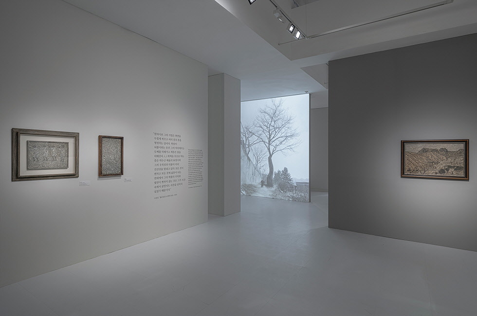 9 박수근의 고향 강원도 양구에서 작가가 즐겨 그렸다고 전해지는 느릅나무 이미지가 보이는 4부 전시 공간.