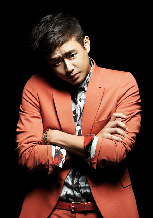 오렌지 컬러 수트와 모노톤 프린팅 셔츠, 레더 벨트 모두 폴 스미스.