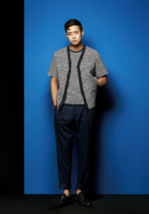 그린 도트 패턴 재킷과 라이트 블루 셔츠, 네이비 팬츠, 블랙 레더 벨트, 스웨이드 태슬 로퍼 모두 Z 제냐.