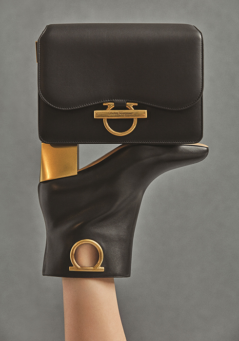 간치니 로고 디테일의 미니 백 2백9만원, 블랙 레더 골드 미러 굽 앵클부츠 1백29만원 모두 살바토레 페라가모.