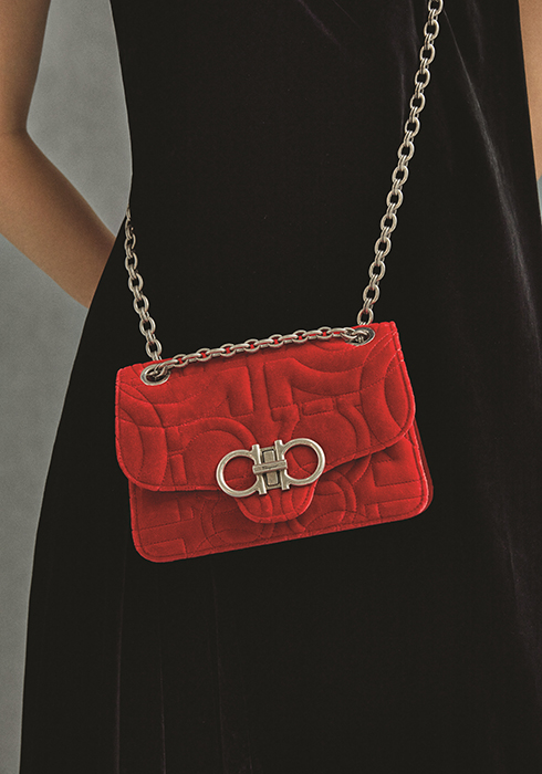 블랙 벨벳 드레스 2백45만원, 간치니 잠금장치 디테일의 미니 체인 백 2백9만원 모두 살바토레 페라가모.