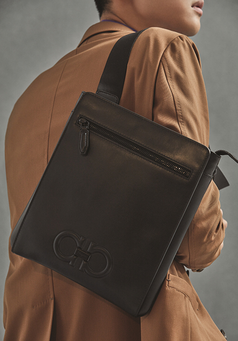 브라운 재킷 2백9만원, 퍼플 컬러 셔츠 42만원, 블랙 미니 크로스 백 89만원 모두 살바토레 페라가모.