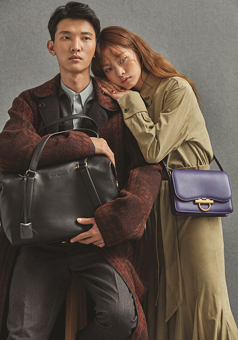 (여자) 베이지 스웨이드 셔츠 5백35만원, 스커트 6백75만원, 퍼플 컬러의 플랩 백 2백9만원 모두 살바토레 페라가모.