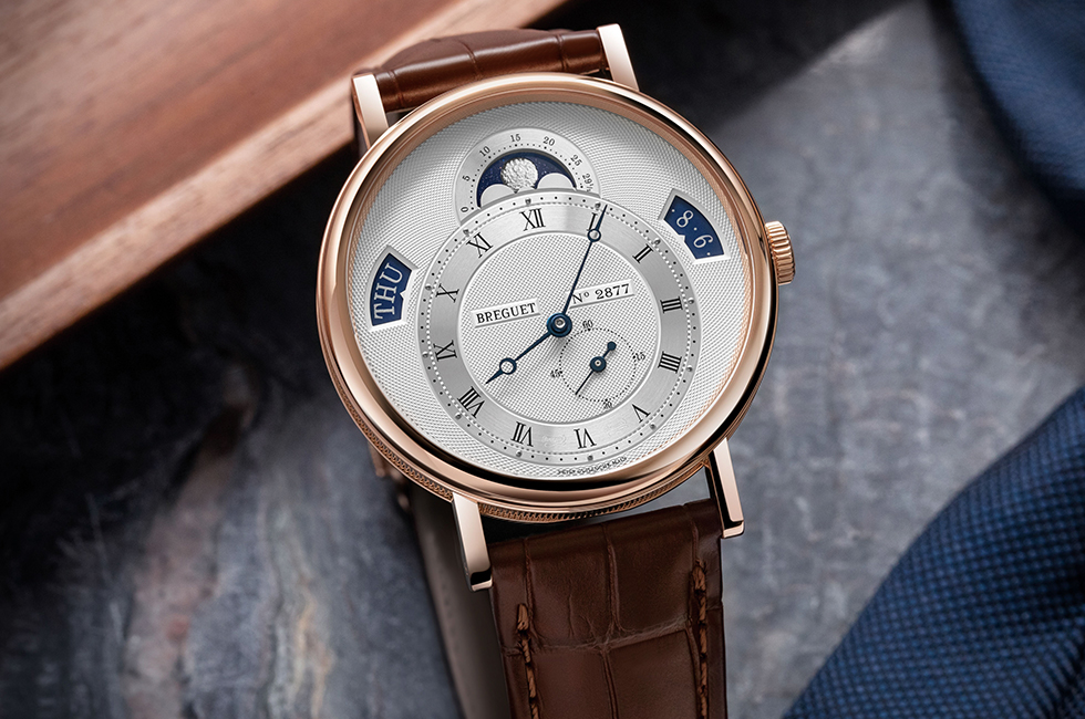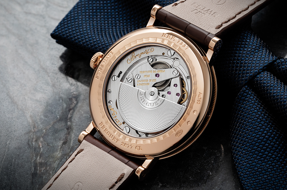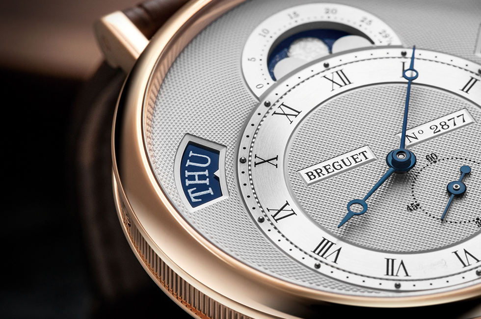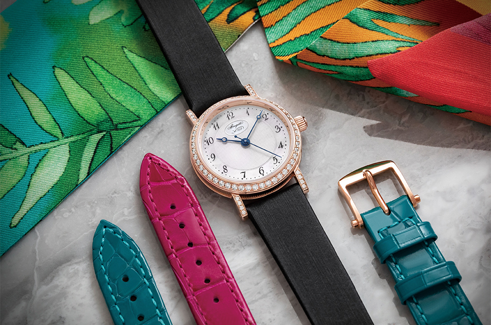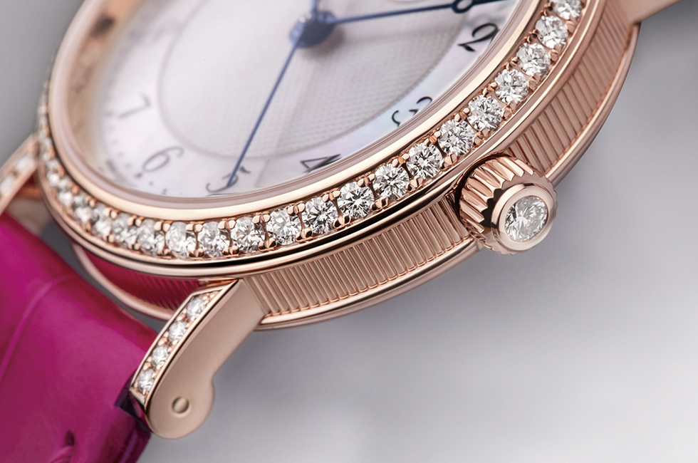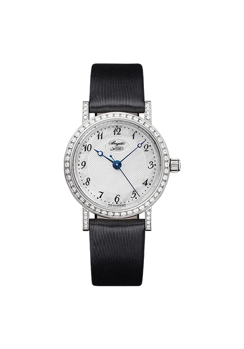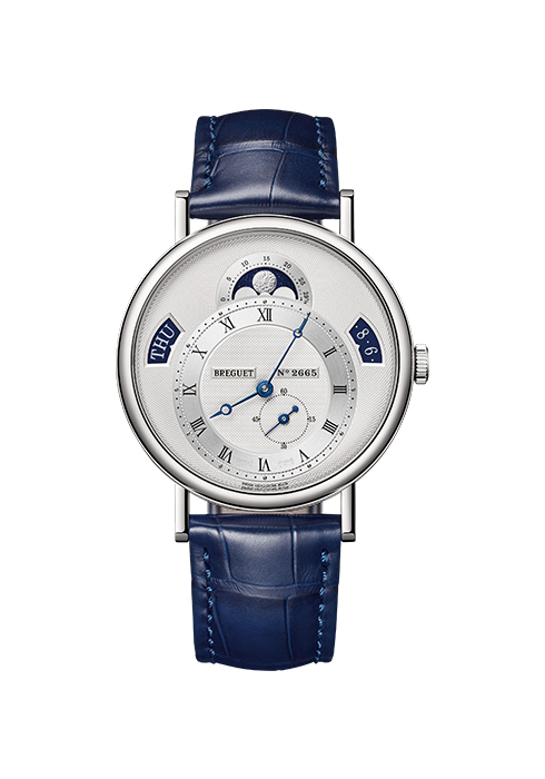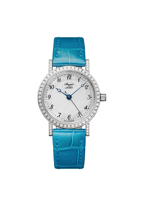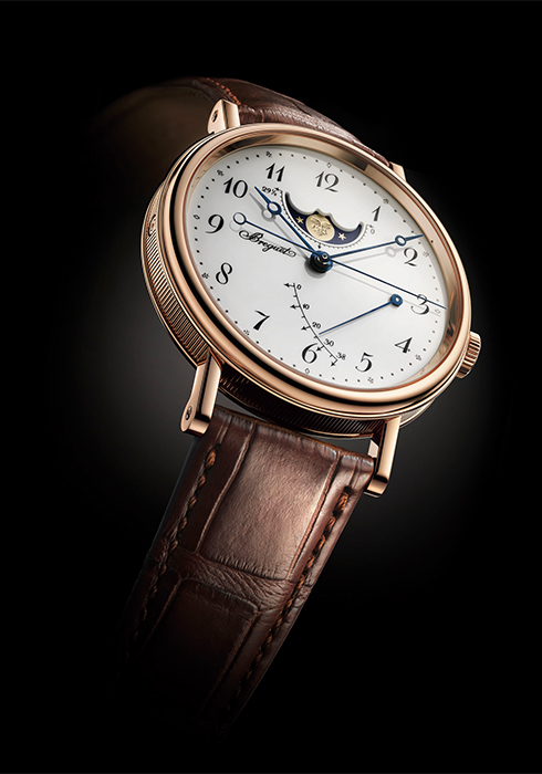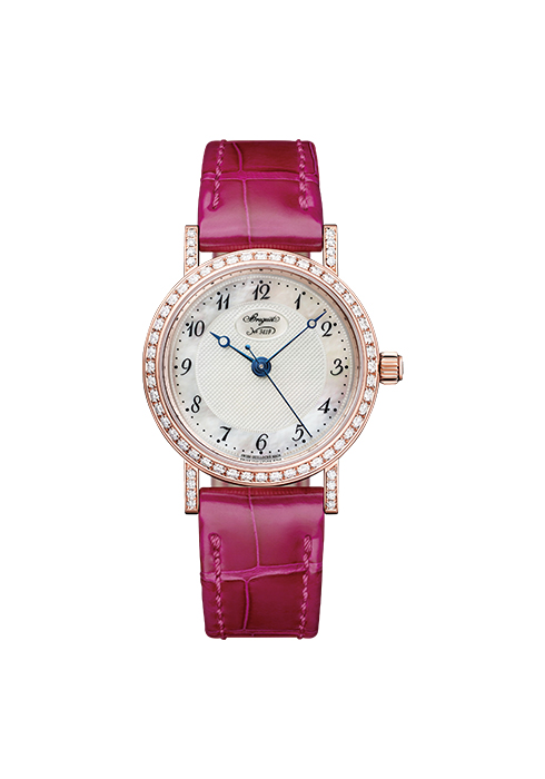 클래식 문페이즈 7787 플루티드 케이스 밴드를 갖춘 지름 39mm의 로즈 골드 케이스에 화이트 컬러의 그랑 푀 에나멜 다이얼을 장착했다. 아라비아 숫자 인덱스는 아브라함-루이 브레게의 첫 번째 손목시계와 탁상시계에 사용한 대표적인 ‘브레게 뉴머럴’ 스타일로 우수한 시인성과 우아함을 갖췄다. 12시 방향에 문페이즈 창이 위치하며, 6시 방향에 세팅한 긴 바늘로 가리키는 파워 리저브 인디케이터는 뛰어난 가독성이 특징이다. 파워 리저브를 표시하는 눈금은 앙증맞은 화살표로 표현했는데, 이는 1785년 발표한 포켓 워치 No.92의 디자인을 차용한 것이다. 2개의 배럴로 기능을 향상시킨 셀프 와인딩 무브먼트 591DRL로 구동하며, 실리콘 이스케이프먼트와 밸런스 스프링을 장착해 충격 완화에 우수한 동시에 자성의 영향을 받지 않는다. 두께는 3.01mm에 불과하다.