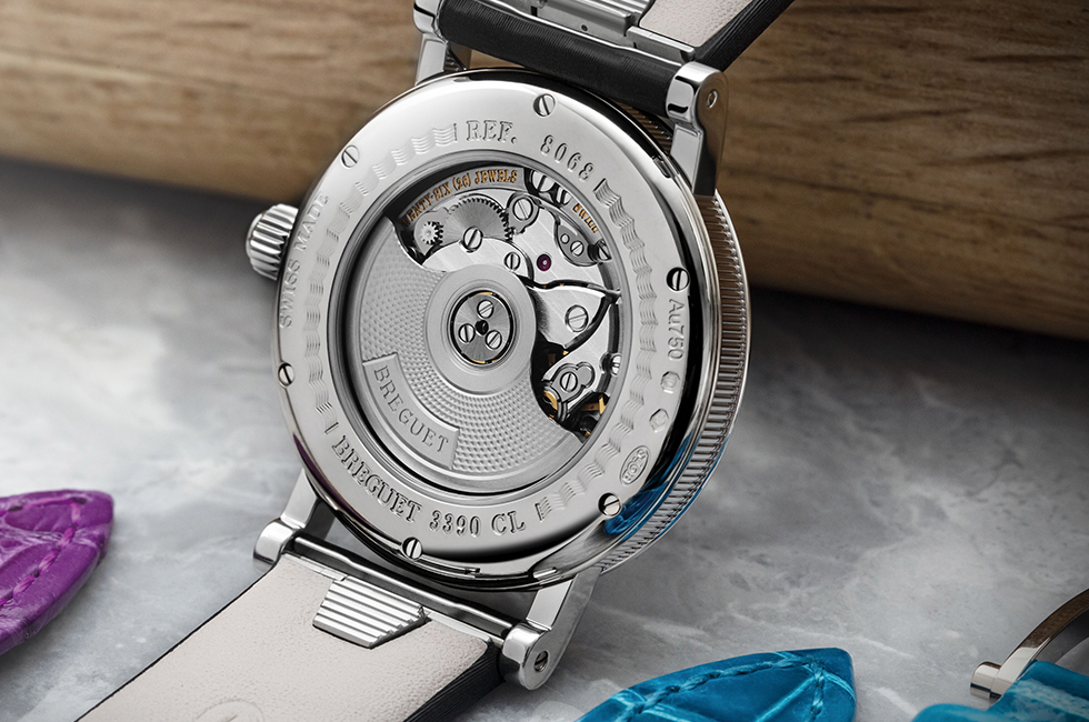 한편 다이얼과 케이스 또한 이전 모델보다 훨씬 더 현대적인 스타일로 단장했다. 챕터링 위로 로마숫자 인덱스 대신 브레게 뉴머럴로 불리는 특징적인 아라비아숫자 인덱스를 프린트해 신선한 인상을 풍긴다. 클루 드 파리 패턴 핸드 기요셰로 장식한 머더오브펄 다이얼을 장착하고, 12시 방향에는 타원형으로 브레게 로고 및 고유 넘버를 배치해 기품 넘친다. 베젤과 러그를 포함한 케이스 전체에는 총 64개의 브릴리언트 컷 다이아몬드를 세팅해 손목 위에서 화사한 광채를 발산한다. 크라운 위 블루 사파이어를 세팅한 초기 모델과 달리 신제품에는 카보숑 컷 다이아몬드를 장식했다. 지름 30mm, 두께 7.7mm의 새로운 클래식 담므 8068은 총 1백91개의 부품으로 이뤄진 인하우스 셀프 와인딩 칼리버 537/3으로 구동하며, 실리콘 밸런스 스프링 및 인-라인 스위스 레버 이스케이프먼트를 갖춰 오차 없이 정교하게 시간을 알린다. 시간당 2만5천 회 진동하며 30m 생활 방수 및 45시간의 파워 리저브가 가능하다. 투명 사파이어 크리스털 케이스 백을 통해 로즈 엔진 위 그랭 도르주 패턴으로 수공 인그레이빙한 플래티넘 로터와 챕터링 및 코트 드 제네브 패턴으로 마감 처리한 무브먼트의 모습을 확인할 수 있다.