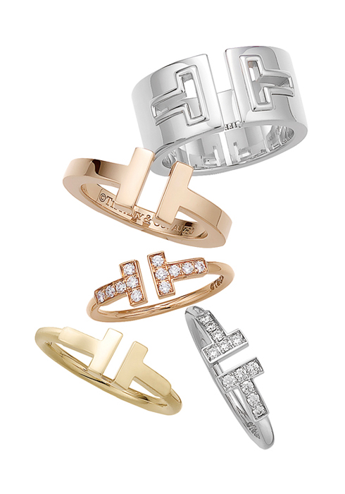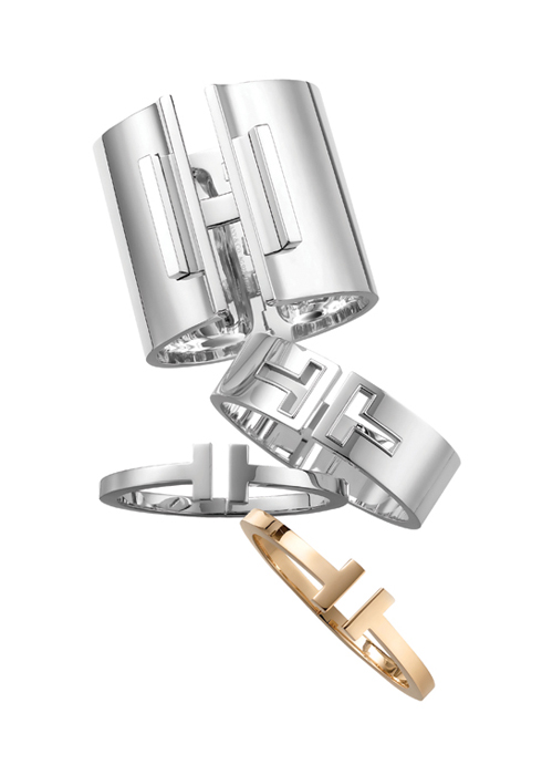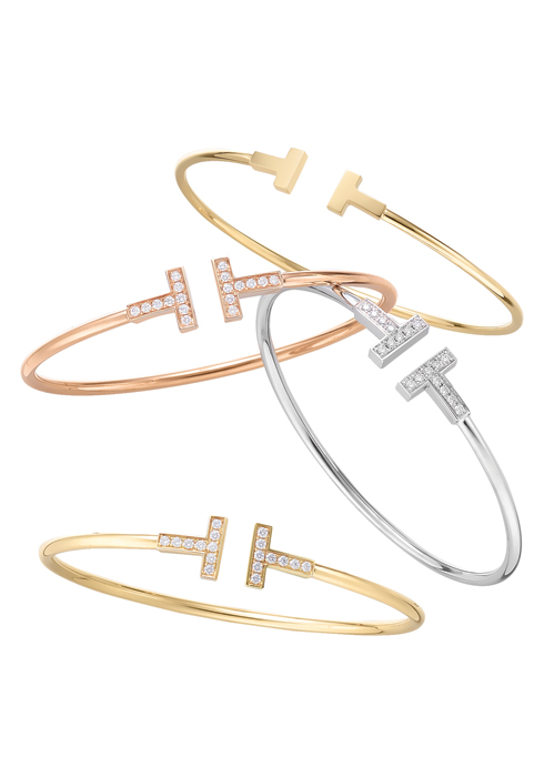 스털링 실버 소재의 와이드 바 커프, T 로고를 오픈워크 처리한 컷아웃 커프, 로즈 골드와 화이트 골드, 옐로 골드 중 선택할 수 있는기본적인 디자인의 스퀘어 브레이슬릿 모두 TIFFANY T 컬렉션.