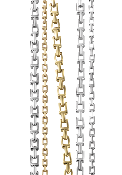 옐로 골드, 로즈 골드, 화이트 골드 등 다양한 소재로 출시한 체인 네크리스와 브레이슬릿. T 로고를 건축적으로 디자인해 볼륨감 있게 완성했다. 2개의 체인을 연결해 롱 네크리스로 활용할 수도 있다. 모두 TIFFANY T 컬렉션.