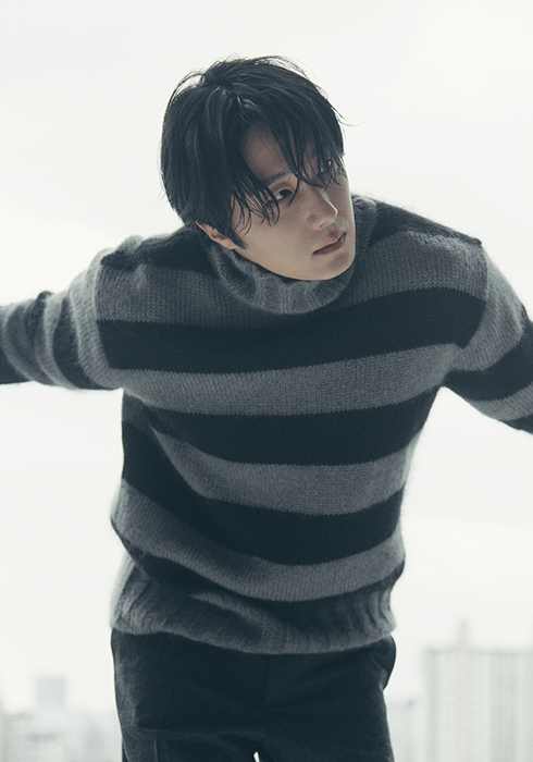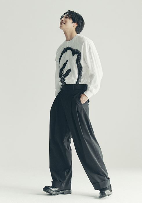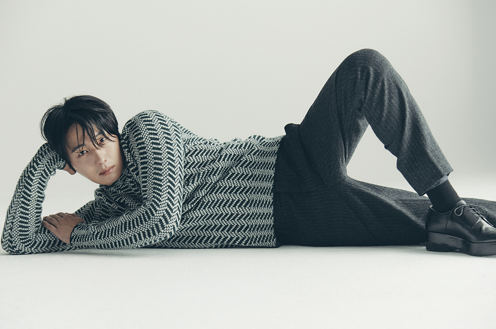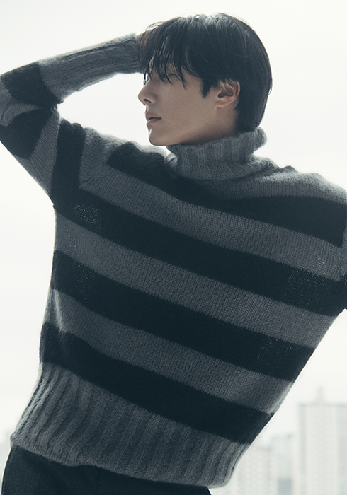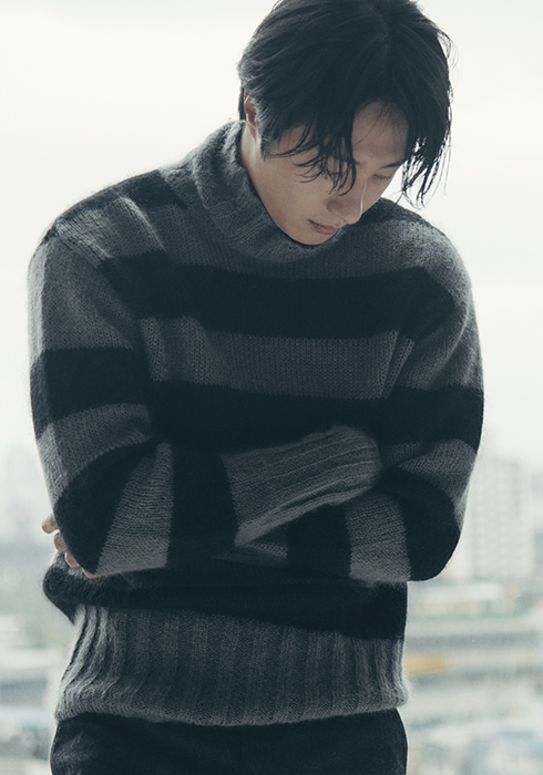 롱 슬리브 니트 풀오버, 와이드 울 팬츠 모두 가격 미정 에르메네질도 제냐. 화이트 카프 레더 스니커즈 가격 미정 처치스. 오른손 약지에 착용한 비제로원 화이트 골드 링 3백만원대 불가리.
