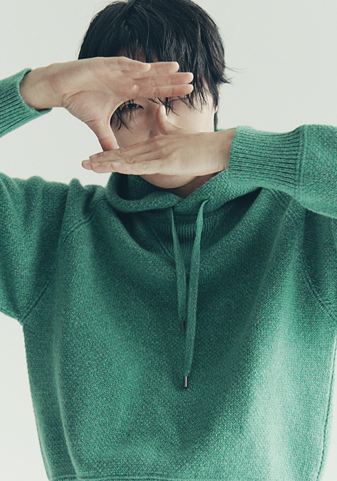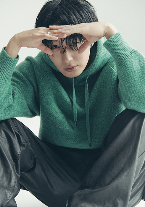그린 컬러 캐시미어 후드 스웨터 2백79만원, 블랙 나파 레더 카고 팬츠 가격 미정 모두 살바토레 페라가모. 왼손 중지에 착용한 비제로원 블랙 세라믹 & 로즈 골드 링 2백만원대 불가리. 오른손 약지에 착용한 클래쉬 드 까르띠에 핑크 골드 링 3백86만원 까르띠에.