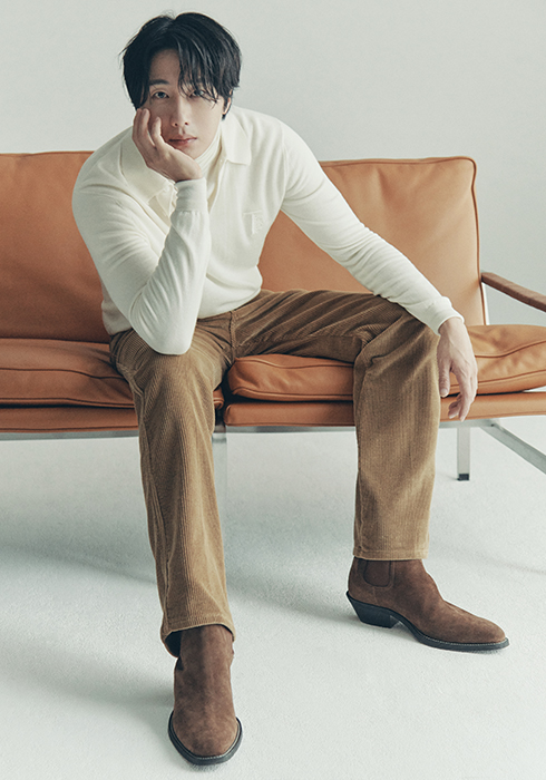 크림색 울 터틀넥 70만5천원, 모노그램 자수 장식 니트 폴로 셔츠 70만5천원, 벨벳 코듀로이 팬츠 70만5천원, 스웨이드 첼시 부츠 1백12만5천원 모두 토즈.