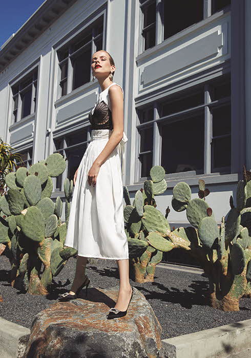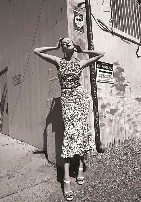 플라워 패턴 슬리브리스 니트 드레스와 플라워 모티브 비즈 장식의 화이트 플레어스커트 가격 미정 모두 마이클코어스 컬렉션. 화이트 스트랩 웨지 슈즈 가격 미정 라펠라. 십자가 모티브 실버 이어링 가격 미정 토마스 사보.
