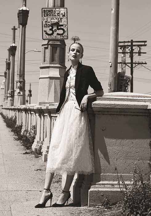 블랙 테일러드 재킷 3백83만원 브루넬로 쿠치넬리. 화이트 레이스 롱 드레스 가격 미정 발렌티노. 블랙 스트랩 스틸레토 힐 가격 미정 지미추. 블루 컬러 스와로브스키 세팅 이어링 38만원 타니 by 미네타니.