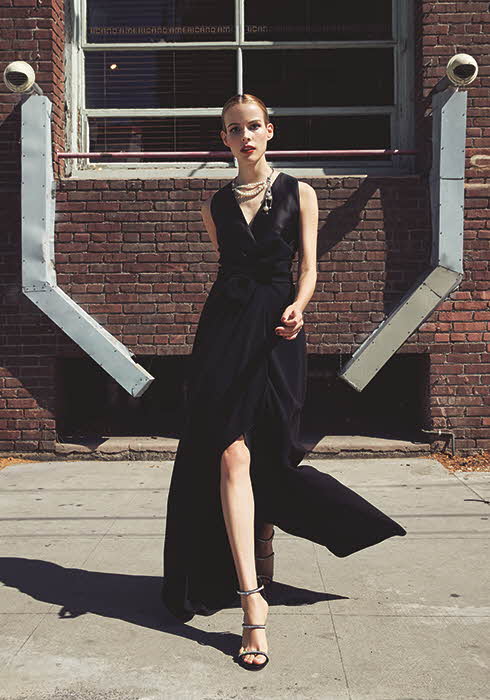 블랙 슬리브리스 롱 드레스 가격 미정 막스마라 엘레간테. 진주 체인 네크리스 1백만원대 에스카다. 주얼 장식 스트랩 슈즈 가격 미정 쥬세페 자노티.