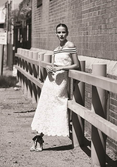 오프 숄더 레이스 드레스 가격 미정 샤넬. 그레이 진주 드롭 네크리스 22만원 타니 by 미네타니. 크리스털 이어링 8만9천원 빈티지헐리우드. 화이트 레이스 디테일의 포디움 기퓌르 리본 슈즈 1백50만원대 로저 비비에. |