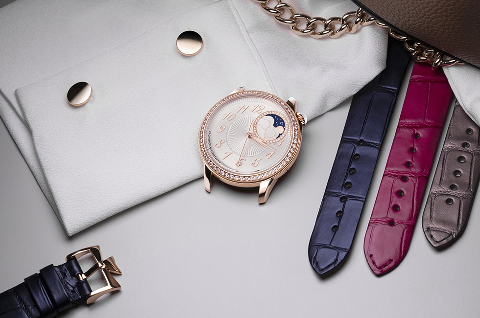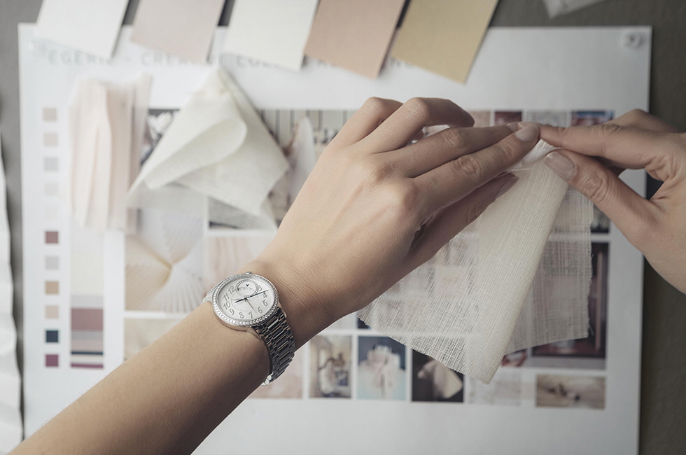 오트 쿠튀르와 파인 워치메이킹은 모든 것이 장인의 손에서 탄생한다는 점이 일맥상통한다. 섬세하고 정교한 기술력은 이 두 분야에서 필수불가결한 요소. 부쉐론 콘스탄틴은 우아한 오트 쿠튀르 세계를 기계식 워치에 구현했다. 지난 2월 17일에 공개한 에제리 컬렉션이 그 주인공. 메종의 대담한 디테일과 감성을 담은 에제리 컬렉션은 셀프 와인딩과 문페이즈 두 버전으로 구성된다. 기존 에제리 컬렉션의 시그니처 오프-센터 디스플레이 디자인을 기반으로 하는데 다이얼은 오팔린 실버 베이스에 태피스트리 기법으로 완성한 플리츠 장식으로 조형적인 멋을 강조했으며, 라운드 컷 다이아몬드를 세팅한 베젤과 세컨드 다이얼로 화려한 분위기를 강조한다. 메종의 또 다른 상징으로 통용되는 1시와 2시 방향에 장착한 크라운에는 카보숑컷 문 스톤을 장식해 착용자의 움직이는 손목에서 은은한 빛을 발하며 우아함도 극대화했다.