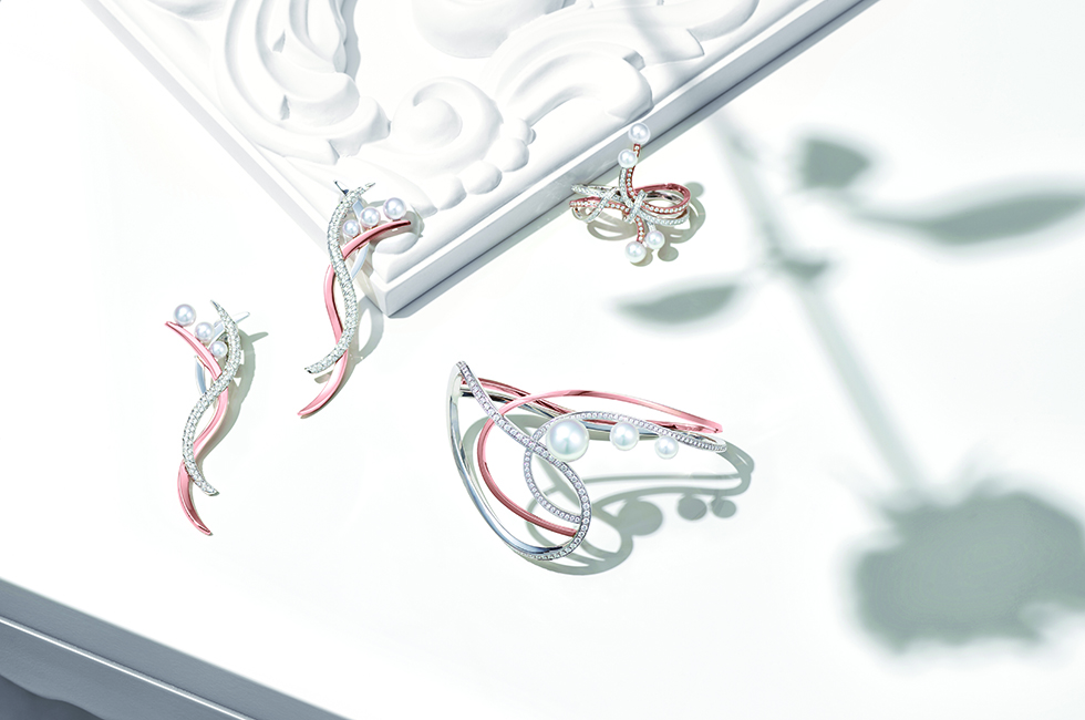 최상급 아코야 진주를 통해 다양하게 퍼지는 우아한 빛을 18K 화이트 골드와 타사키만의 시그너처 벚꽃 컬러인 SAKURAGOLD™를 통해 깨끗하고 선명한 라인으로 디자인한 나크리어스 컬렉션. 마치 여러 겹의 머더오브펄이 빛을 발산하는 것처럼 신비하고 오묘한 컬러들의 반짝임을 표현했다. (왼쪽부터 시계 방향으로) 귀에 화려함을 더해줄 드롭 이어링, 독특한 레이어드 디자인의 더블 핑거 링, 착용 시 손에 은은한 광채를 선사할 핸드커프 브레이슬릿 모두 타사키.