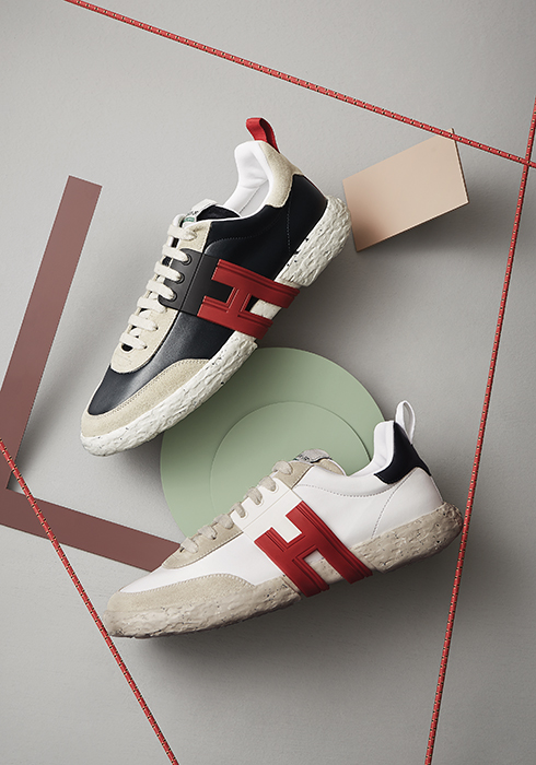 남성용 사이즈의 호간 3R 스니커즈. 마찬가지로 재생 가죽과 재활용 플라스틱을 혼합해 제작했다. 화이트 가죽에 레드 컬러 로고와 네이비로 포인트를 준 버전과 네이비 가죽에 레드 컬러의 H 로고와 그레이 컬러 디테일을 더한 버전으로 선보인다. 언제 어디서나 어떤 의상에든 매치하기 좋다. 69만5천원.