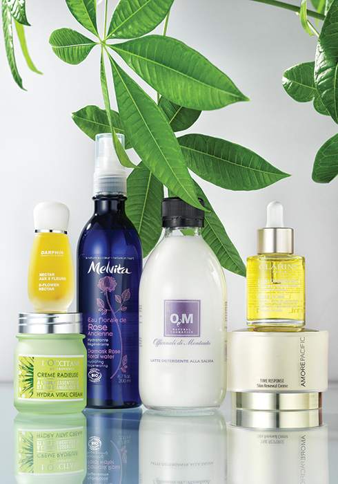 피부에 풍부한 수분을 전달하고 이 수분과 보습력을 오랫동안 지속시키는 엔젤리카 씨앗을 주원료로 한 ‘록시땅 엔젤리카 하이드라 바이탈 젤’. 엔젤리카는 프로방스에서 단 며칠 만에 수십 미터가 자라는 놀라운 식물로, 스스로 수분을 흡수하는 능력이 뛰어난 것이 특징이다. 강력한 보습력을 겸비한 가볍고 산뜻한 아쿠아 쿨링 젤 타입으로 건조한 바람이 불어오는 봄날에 사용하면 제격이다(50ml 4만8천원). 식물성 아로마 코즈메틱 브랜드의 정수를 담은 ‘달팡 8-플라워 넥타 아로마틱 에센셜 오일 엘릭시르’는 로즈, 아이리스, 임모르텔, 라벤더 등 진귀한 여덟 가지 아로마 꽃 추출물을 농축해 담아 피부 탄력을 높이는 데 도움을 주는 안티에이징 페이셜 오일이다. 신비로운 꽃 향이 트리트먼트 내내 아로마테라피 효과를 선사하고, 피부 정화 작용과 함께 독소를 배출해 맑고 깨끗한 피부로 가꿀 수 있다(15ml 23만5천원). 에코서트와 코스메 비오 유기농 인증을 받은 ‘멜비타 로즈 플로럴 워터’에는 유기농 장미 꽃잎이 무려 2천 송이가 담겨 있다. 진정 및 보습 효과가 뛰어나기로 유명한 100% 유기농 장미수만 사용해 민감성 피부에 효과적. 토너로 사용하거나 미스트로 활용해 건조할 때마다 수시로 뿌려주면 향기로운 장미 향과 함께 그 효과 또한 톡톡히 볼 수 있다(200ml 3만8천원). ‘오엠 세이지 마사지 클린징 밀크’에 함유된 세이지 추출물은 로마 시대부터 유래된 치유의 약초다. 과도한 피지를 제거하고 세안 후 촉촉함을 더해 피부의 유수분 밸런스를 맞춰준다. 로션 타입 클렌저를 얼굴에 도포하고 마사지하면 모공 속에 정체된 수분과 노폐물을 효과적으로 제거할 수 있다(250ml 7만7천원). ‘클라란스 리밸런싱 트리트먼트 페이스 오일’은 100% 순수 식물 추출물을 담은 페이셜 오일로, 예민한 피부도 안심하고 사용할 수 있다. 건조한 피부의 균형을 되찾아주는 블루 오키드와 생기를 부여하는 파촐리, 혈색을 더해주는 로즈우드 오일을 담아 이 오일 하나만 발라도 생기가 감도는 건강한 피부로 가꿀 수 있다(30ml 6만2천원). 녹차에 대한 아모레퍼시픽의 노하우를 모두 집약한 ‘아모레퍼시픽 타임 레스폰스 스킨 리뉴얼 크림’에는 고귀한 첫물 녹차와 함께 아시안 보태니컬 성분을 더해 강력한 안티에이징 효과를 선사한다. 은은한 녹차 향은 아로마테라피 효과까지 선사하니, 녹차의 고귀한 에너지를 느껴볼 것(50ml 48만원).