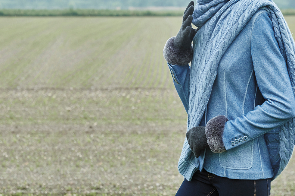 염색 후 다시 세탁하는 과정을 거쳐 자연스러운 이탤리언 컬러로 완성한 콜롬보의 시그너처 캐시미어 재킷 케이트. 래빗 퍼를 매치한 니트 글러브. 촉감만으로도 최고의 캐시미어라는 것을 느낄 수 있는 오렌지 컬러 캐시미어 숄. 포근하고 부드러운 느낌이 매력적인 캐시미어 글러브. 모두 콜롬보 노블 파이버.