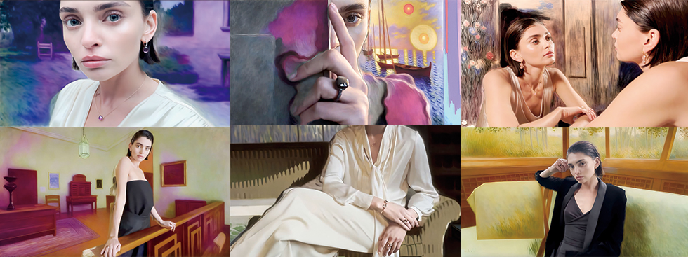 콜롬보는 이번 프로젝트를 위해 10개의 누도 젬스톤을 선택했고, 각각의 젬스톤에서 느낀 감정을 몰입감 있게 ‘움직이는 그림’으로 표현했다. 그가 선택한 젬스톤과 감정은 로즈 쿼츠와 공감, 프레지오라이트와 집중, 애미시스트와 야망, 가닛과 강렬함, 레몬 쿼츠와 희열, 화이트 토파즈와 감사 등이다. 현실과 상상의 세계가 융합되어 마법 같은 무언가를 만들어내는데, 누도 젬스톤이 지닌 생생한 본질을 드러내준다. 이 영상은 1930년대 밀라노 시내에 위치해 도시를 상징하는 아방가르드한 매력을 발산한 것으로 유명한 빌라 네키(Villa Necchi)에서 촬영했다. 작품 속 모델은 젬스톤을 세팅한 누도 주얼리를 착용하고 빌라 네키 주위를 거닐며 컬러로 가득한 다채로운 시각적 여정 속에서 다양한 감정을 경험한다. 빌라 네키에서 영상을 촬영한 다음 이를 AI로 가공하고, 인상주의 색채 코드와 미학을 동원해 상상의 세계에서 피어난, 각기 다른 개성을 지닌 여성들의 초상화를 그려냈다. 인상주의는 순수한 색채의 느낌을 얻기 위해 아카데미즘 회화의 규칙을 깬 미술 사조이기에, 통념을 깨는 누도 컬렉션의 성격과도 잘 맞아떨어진다.