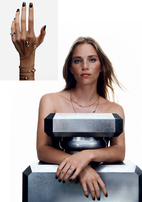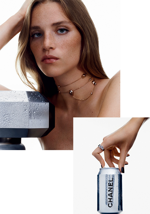 롱 네크리스를 여러 번 레이어링해 패셔너블한 스타일링을 완성했다. 브릴리언트 컷 다이아몬드를 세팅한 18K 베이지 골드 소재의 LES INFINIS DE N°5 변형 가능한 롱 네크리스, 브릴리언트 컷 다이아몬드를 세팅하고 18K 베이지 골드 소재로 완성한 이터널 N°5 링.