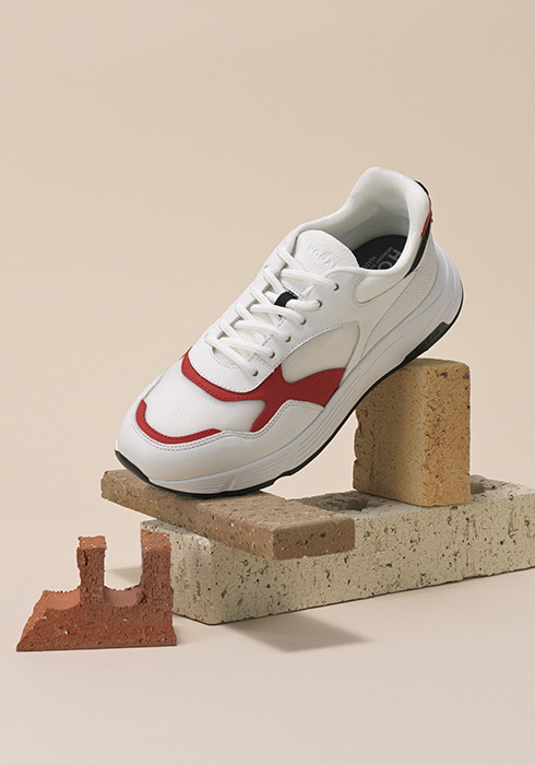 밑창은 미끄러짐을 방지하고 쿠션감을 더하는 스터드 디테일의 고무 트레드를 적용했다. 화이트 컬러 보디에 레드 포인트로 경쾌함을 더한 모델 58만원 호간.