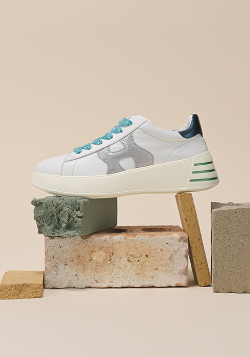 실버, 블루, 그린 톤이 조화를 이룬 여성용 스니커즈 레벨(Rebel). 인체공학적으로 설계한 두께 5cm의 청키한 러버 솔은 가볍고 유연해 뛰어난 착화감을 보장한다. 슈즈 측면에는 브랜드 고유의 H 모노그램을, 어퍼에는 로고 장식을 더해 고유의 아이덴티티가 두드러진다. 58만원 호간.