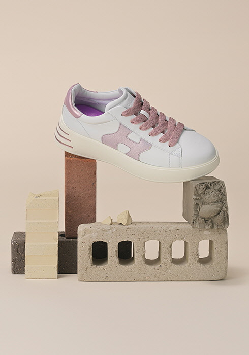 캐주얼하고 패셔너블한 무드로 즐길 수 있는 여성용 스니커즈 레벨. 새롭게 디자인한 곡선형의 브랜드 로고 H 모노그램과 슈즈 뒤축의 핑크 컬러 레더로 포인트를 줬다. 은은한 펄과 크랙(crack) 효과를 구현해 더욱 멋스럽다. 함께 매치한 핑크 컬러 슈 레이스에도 글리터 디테일을 가미해 사랑스럽다. 58만원 호간.