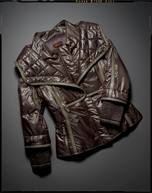 칼라 부분을 탈착할 수 있는 카키 브라운 패딩 재킷. 2백1만원 토즈.
