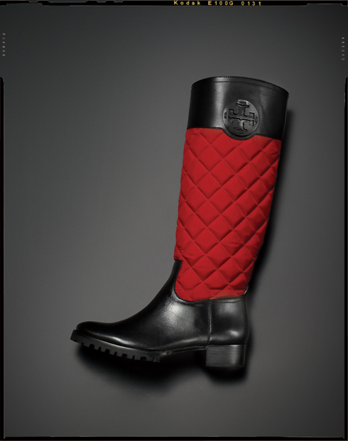 레드 컬러 패딩 디테일이 돋보이는 웰링턴 스타일의 롱부츠. 87만8천원 토리 버치.