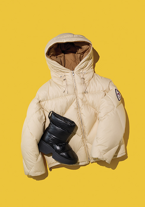 (왼쪽) 램 스킨 소재에 웨지 고무 밑창을 더해 볼륨감을 준 패더드 앵클부츠 1백60만원대 로에베. 문의 02-3479-1785 (오른쪽) 가볍고 실키한 무광 마감의 기능성 원단으로 만든 쇼트 다운 재킷 5백36만원 로로피아나. 문의 02-546-0615