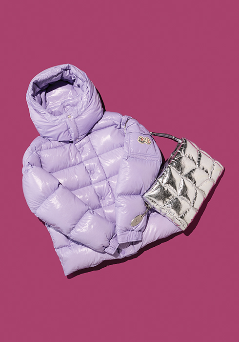 (왼쪽) 나일론 패브릭을 특수 레진으로 처리해 유광 질감이 돋보이는 은은한 파스텔 퍼플 컬러의 마야 70 쇼트 다운 재킷 2백65만원대 몽클레르. 080-311-0000 (오른쪽) 부드러운 카프 스킨에 메탈 포일 효과를 내도록 라미네이트 처리해 반짝이는 매력을 더한 스타일리시한 소프티 클러치 1백81만원대 멀버리. 문의 02-2018-1439