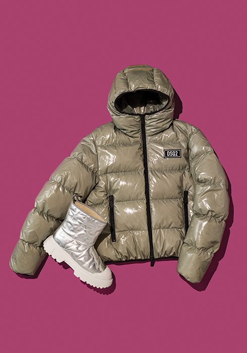 (왼쪽) 라미네이트 처리한 레더와 페이크 퍼 소재의 메탈릭 실버에 스포티하고 볼드한 화이트 아웃솔을 매치해 스포티하면서 청키한 느낌을 주는 부츠 96만원 호간. 문의 02-3479-1593 (오른쪽) 글로시한 느낌의 나일론으로 힙한 감성을 더하고 오리털로 충전해 가볍고 따뜻한 록 유어 로드 후드 푸퍼 패딩 1백57만원 디스퀘어드2. 문의 02-3479-1296