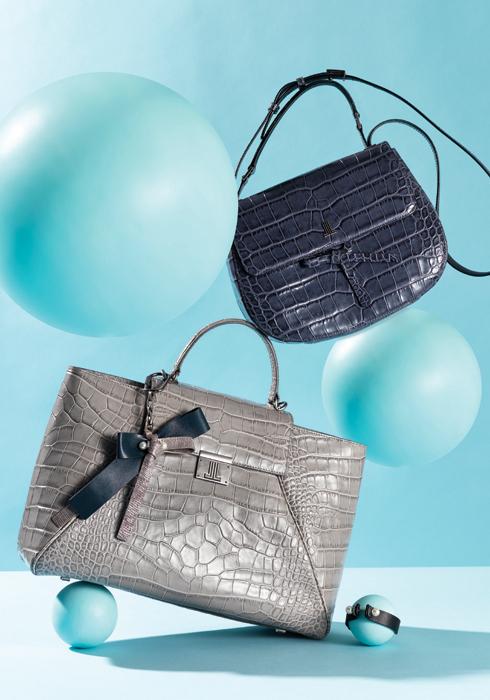 (왼쪽부터) 브랜드 고유의 퀼팅인 더블 JL(Double JL) 패턴과 체인 스트랩이 클래식한 느낌을 선사한다. 가죽 내부에 오일을 침투시켜 특유의 광택감과 가죽이 갈라진 듯한 크랙 디테일이 특징인 풀업 가공 방식으로 제작, 자연스러운 투톤 그러데이션이 돋보이는 오페라 미디엄 숄더백 79만5천원, 오페라 스몰 숄더백 73만5천원, 앞에는 진주 장식이, 뒤에는 리본 장식이 어우러진 롱 체인 네크리스 29만5천원 모두 랑방컬렉션 액세서리. (위에서 아래로) 가죽을 꼬아 만든 리본 디테일이 앙증맞은 네이비 센느 새들백 93만5천원, 사다리꼴의 독특한 셰이프가 특징이며 고급스러운 크로코 엠보 소재로 디자인한 트라페즈 라지 토트백 1백5만원, 함께 레이어링한 리본 모티브 참장식과 진주 포인트의 가죽 브레이슬릿 각 16만5천원 모두 랑방컬렉션 액세서리.