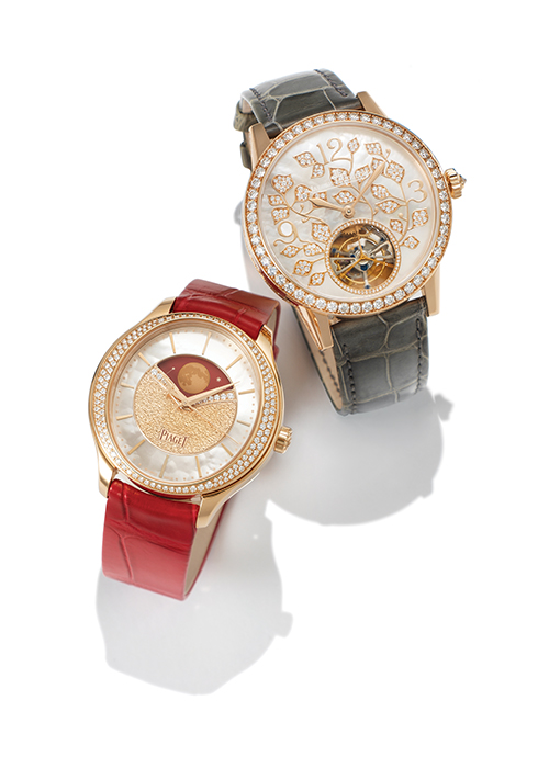 피아제 라임라이트 스텔라 워치 머더오브펄을 바탕으로 다이얼 중앙 전면에 우아한 레드빛 문페이즈 디스플레이를 올리고, 14개의 브릴리언트 컷 다이아몬드로 기품을 더했다. 여기에 약 0.64캐럿의 1백26개 다이아몬드를 베젤에 두르고, 레드 앨리게이터 스트랩으로 우아하게 마무리. 피아제 자체 제작 584P 셀프 와인딩 무브먼트로 구동한다. 5천2백만원대. 문의 02-3479-1802