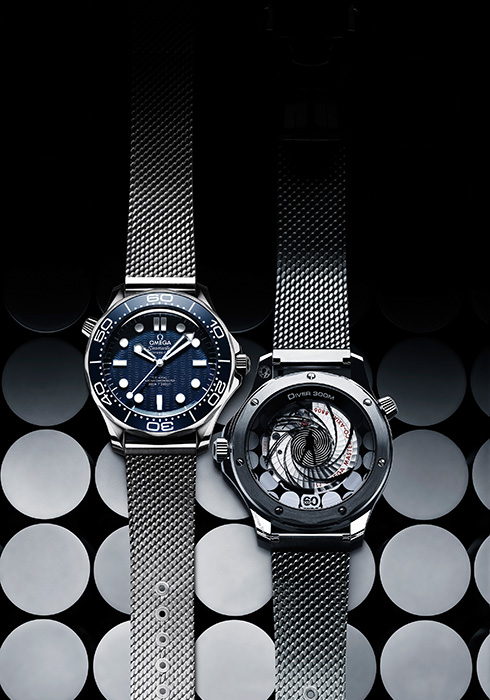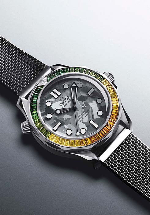 오메가 시계는 1995년 <007 골든 아이>에서 제임스 본드의 시계로 선정된 이후 세계에서 가장 유명한 스파이, 007과의 인연을 이어오고 있다. 아카데미상을 수상한 의상 디자이너, 린디 헤밍(Lindy Hemming)은 영국 해군 출신인 007의 이력을 고려할 때 씨마스터 다이버 300M이 가장 적합하다는 현명한 결정을 내렸다. 제임스 본드 탄생 60주년 기념 씨마스터 다이버 300M은 42mm 사이즈의 스테인리스 스틸 시계로 영화 <골든 아이>에서 제임스 본드가 착용한 씨마스터에서 영감을 받은 시계. 실제로 007 영화 테마를 반영해 특별한 미세 구조 금속화로 장식한 사파이어 하단의 케이스 백에 제임스 본드 실루엣과 회전하는 건 배럴이 등장하는 007 오프닝 시퀀스를 새겨 넣었다. 여기에 롤리팝 센트럴 세컨즈 핸드가 회전하면서 특허출원 중인 ‘무아레(moire´)’ 효과 애니메이션 연출로 눈길을 끌었다. 베젤과 다이얼은 양극 산화 처리한 블루 알루미늄으로 제작했고, 다이얼은 레이저로 각인한 물결 패턴으로 장식되어 있으며, 베젤은 화이트 슈퍼루미노바Ⓡ를 채운 다이빙 스케일을 갖추었다. 다이빙 스케일의 역삼각형을 대신하는 기념 숫자 ‘60’ 및 미닛 핸드와 연결되는 초록색 야광 도트도 타임피스에서 눈여겨봐야 할 특징. 제임스 본드 탄생 60주년을 기념하는 또 하나의 특별한 타임피스는 오랜 기간 눈부신 광채를 유지한다고 알려진 오메가의 18K 캐노푸스 골드™(Canopus Gold™)로 제작되었다. 자메이카 국기를 연상시키는 베젤에는 엑스트라 다크 포레스트 그린에서 올리브, 옐로, 골드, 코냑 등 10가지 트로피컬 컬러를 띤 그린 및 옐로 다이아몬드를 파베 세팅했다. 12시 방향에 세팅한 2개의 다이아몬드는 제임스 본드 탄생 60주년을 기념하는 타임피스에 광채를 더해준다. 코-액시얼 마스터 크로노미터 칼리버 8807로 구동하며 18K 캐노푸스 골드™ 소재의 브레이슬릿과 버클을 장착했다.