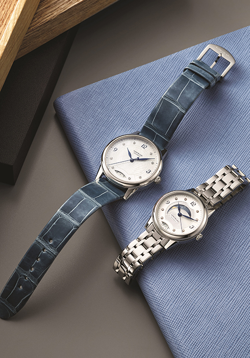 (왼쪽 아래) 레더 스트랩을 더해 더욱 클래식한 스타 레거시 문페이즈 42mm 5백28만원, 스타 레거시 스몰 세컨드 다이아몬드 32mm 6백1만원 모두 몽블랑.