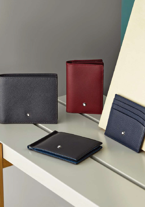 (왼쪽부터) 사토리얼 지갑 8cc 다크 그레이 41만원, 버건디 컬러 마이스터스튁 비즈니스 카드 홀더 25만원, 블루 컬러의 소프트 그레인 포켓 6cc 15만원, 외부의 블랙 가죽과 내부의 라이트 블루 베지터블 태닝 가죽이 조화를 이루는 머니 클립 6cc 40만원 모두 몽블랑.