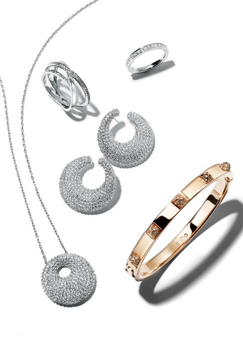 모던한 원형 모티브 펜던트에 크리스털을 파베 세팅한 스톤 펜던트 18만5천원, 세 줄의 밴드 링을 언밸런스하게 매치해 우아한 곡선을 더한 스파이럴 미니 링 21만5천원, 심플한 라인이 돋보이는 레어 링 8만9천원, 스톤 펜던트 네크리스와 함께 매치하면 더욱 매력적인 스톤 이어링 21만5천원, 모던하고 심플한 메탈 밴드에 크리스털로 포인트를 준 택틱 뱅글 21만5천원 모두 스와로브스키.