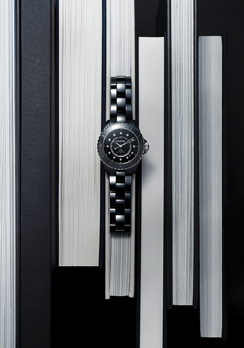 지름 33mm 블랙 세라믹과 스틸 소재 케이스에 다이아몬드를 세팅한 베젤로 화려하고 우아한 감성을 더했으며, 인디케이터 역시 다이아몬드로 마무리해 여성스러운 무드를 부각한 J12 워치 33MM 1천8백20만원대 샤넬 워치.