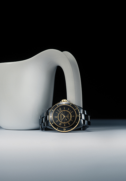 J12의 구조를 더욱 강조하는 압도적인 블랙 세라믹 소재에 옐로 골드 컬러 포인트를 세련되게 매치했다. 셀프 와인딩 매뉴팩처 무브먼트 칼리버 12.1을 장착했으며, 18K 옐로 골드로 스크루-다운 크라운을 완성해 럭셔리함을 배가하는 J12 워치 칼리버 12.1 38MM 2천2백60만원대 샤넬 워치.