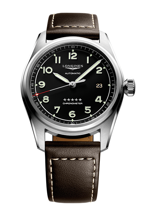 오버사이즈 크라운, 플랜지, 크리스털 글라스 둘레의 분명한 층, 다이얼의 폰트, 다이아몬드 형태 인덱스, 야광 처리한 큰 바톤 핸즈 등의 요소는 모두 앞다투어 비행 기록을 세우던 20세기 초 파일럿 워치의 스타일을 대변한다. 실제 상황에 유용한 이러한 요소들을 재작업하고 업데이트해 현대적인 디자인과 조화롭게 융합한 시계가 바로 론진 스피릿이다. 양면에 여러 층으로 반사 방지 코팅 처리한 반구형 사파이어 크리스털, 스크루-인 크라운, 6개의 스크루로 고정한 인그레이빙 케이스 백이 과거와 현대의 디자인을 융합해 컬렉션의 완성도를 높였다. 그레인드 실버와 매트 블랙, 혹은 선레이 블루 다이얼에 스탬핑한 5개의 별은 론진 전통에 따라 무브먼트의 퀄리티를 신뢰할 수 있음을 나타내는 것. 별 5개는 평가할 수 있는 최고 점수다. 론진 스피릿 컬렉션에는 스틸 브레이슬릿 혹은 다크 브라운이나 라이트 브라운, 블루 가죽 스트랩을 장착할 수 있다. 프레스티지 에디션 구매 시에는 스틸 브레이슬릿에 추가로 가죽 스트랩과 나토 가죽 스트랩이 제공된다. 문의 02-310-1597