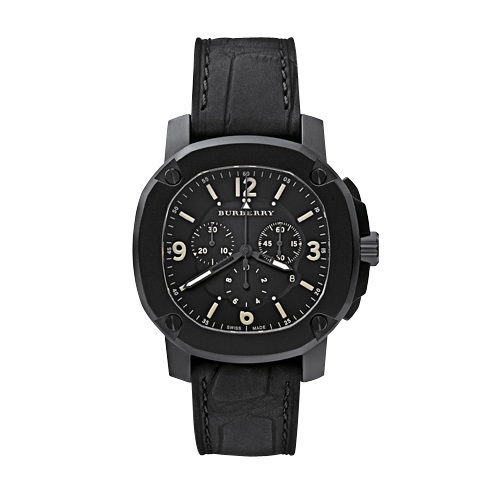 3 크로노그래프 BBY1103. 블랙 IP 도금으로 마감 처리된 스테인리스 스틸 볼트. 러그와 베젤을 완벽하게 조여준다. 고무 처리된 매트 블랙 컬러의 악어 가죽 스트랩. 5기압 방수(160피트/50미터).