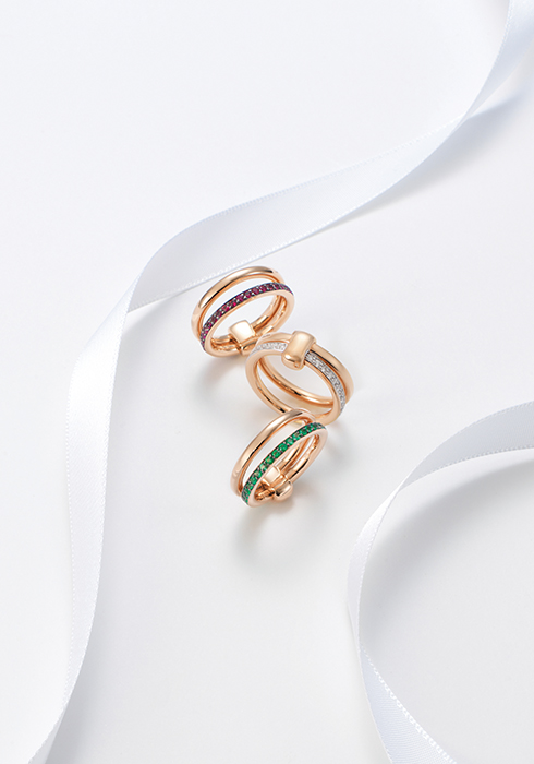 (위부터)18K 로즈 골드 소재의 더블 라인 밴드에 총 0.6캐럿, 36개의 루비를 세팅해 불타는 사랑의 열정을 떠올리게 한다. 가격 미정. 18K 로즈 골드 소재의 더블 라인 밴드에 총 0.4캐럿, 36개의 다이아몬드를 세팅해 영원한 사랑을 상징하는 이코니카 링 가격 미정. 18K 로즈 골드 소재의 더블 라인 밴드에 총 0.4캐럿, 36개의 부드러운 그린 컬러 에메랄드를 세팅해 희망과 평화를 약속하는 의미를 지닌 이코니카 링 가격 미정. 문의 02-3143-9486