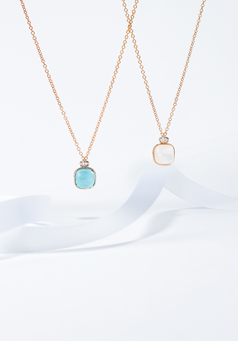 포멜라토 누도 펜던트 네크리스 스톤의 다양성과 높은 품질을 자랑하는 하우스 시그너처 디자인인 누도 컬렉션의 네크리스다. 포멜라토의 독창적인 클레시드라 컷(clessidra cut)으로 완성했는데, 이 커팅은 1개의 젬스톤 또는 2개의 젬스톤을 앞뒤로 결합한 뒤 중앙에 골드 밴드를 둘러 스톤 색조에 깊이감을 더하는 기법으로, 많은 이들의 사랑을 받는다. 심플하면서도 세련된 디자인과 스톤의 매력을 극대화해 하나만으로도 강렬한 포인트와 개성을 표현한다.