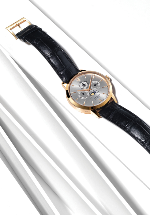 몽블랑의 전설적인 만년필 마이스터스튁 컬렉션 탄생 90주년을 기념해 선보인 워치 컬렉션. 39mm 다이얼, 18K 레드 골드 케이스에 퍼페추얼 캘린더, 문페이즈 기능까지 담아 클래식하다. 화이트 실버 다이얼은 사방으로 뻗어나가는 듯한 햇살의 아름다움을 느낄 수 있는 봄베 다이얼로 고안해 입체적이다.