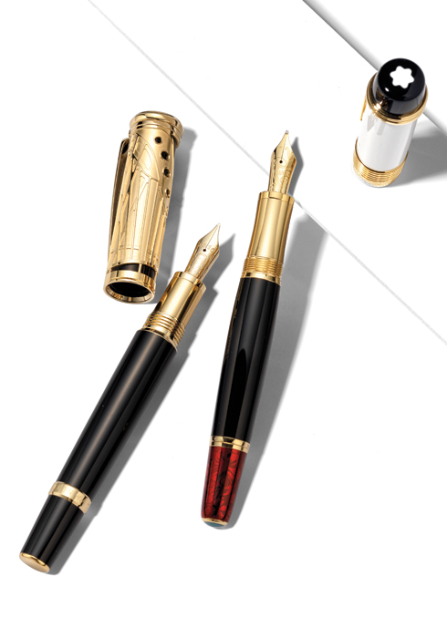 매년 문화 예술을 후원한 이들에게 경의를 표하는 후원자 펜 컬렉션 중 (왼쪽) 2014년에는 현대 피아노의 창시자인 스타인웨이를 기리는 ‘헨리 E. 스타인웨이 리미티드 에디션 4810?을 선보여 그랜드피아노 모티브로 완성했다. (오른쪽) 2015년에는 ‘루치아노 파바로티 리미티드 에디션 4810?을 출시했는데, 파바로티가 무대에서 즐겨 입었던 블랙 턱시도, 화이트 셔츠, 화이트 보타이에서 영감을 받아 블랙 래커 보디와 화이트 래커 캡으로 완성했다. 캡을 우아하게 감싼 도금 클립은 파바로티의 상징인 스카프 모양이다.