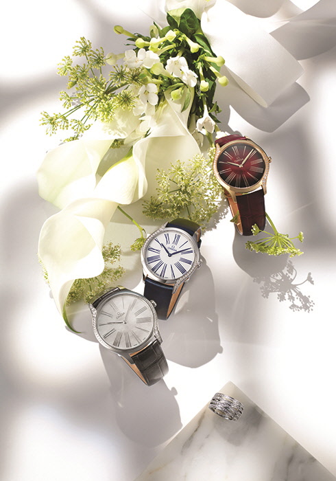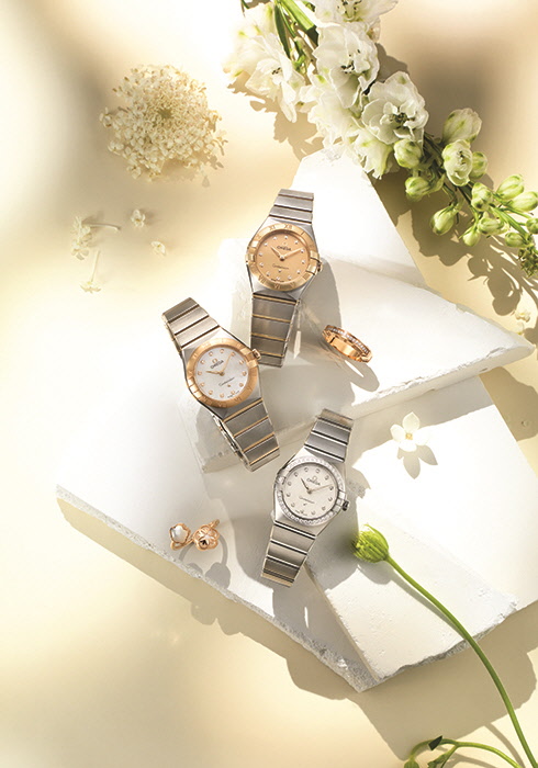 베젤 아래위로 눈길을 사로잡는 반달 모티브와 케이스에 장착한 클러, 모노 랭 브레이슬릿은 이 컬렉션의 핵심 디테일이다. 타임피스의 심장부에는 오메가 칼리버 4061을 장착했고, 케이스 백에는 컨스텔레이션 천문대 메달리언이 스탬핑되어 있다. (위부터) 로마숫자를 새긴 베젤과 선 브러시드 패턴의 샴페인다이얼, 다이아몬드 인덱스 등 18K 옐로 골드와 스틸을 매치한 컨스텔레이션 맨해튼 워치 5백만원대, 화이트 실버 다이얼을 더한 18K 옐로 골드 및 스틸 버전 컨스텔레이션 맨해튼 워치 5백만원대, 간결함과 아이코닉 디자인을 결합하고 18K 레드 골드에 38개의 다이아몬드를 세팅한 컨스텔레이션 링 3백만원대, 지름 25mm의 스틸 케이스에 다이아몬드를 파베 세팅하고 화이트 실버 다이얼을 매치한 컨스텔레이션 맨해튼 워치 7백만원대, 디자인의 영감이 되어준 활짝 핀 꽃봉오리를 모티브로 하고 18K 레드 골드에 자개 카보숑 2개를 세팅한 오메가 플라워 링 1백만원대. 모두 오메가. 문의 02-511-5797 에디터 장라윤