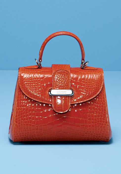최상급 악어가죽에 윤기가 흐르는 광택을 입힌 월스트리트 미니 백. 선명한 오렌지 컬러가 심플한 룩을 화사하게 만든다. 24X16cm, 2천만원대 콜롬보.