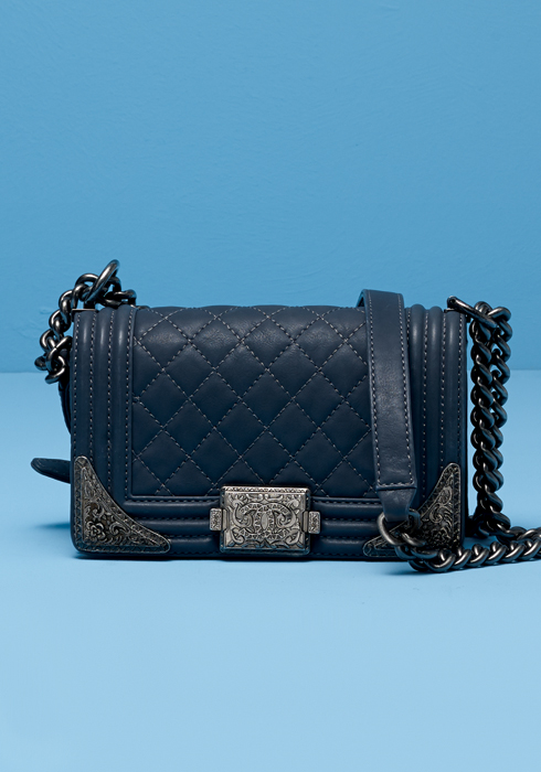 빈티지한 버클과 가장자리의 장식, 체인 스트랩의 조합이 멋스러운 달라스 컬렉션의 보이 샤넬 백. 베이식한 네이비 컬러라 유행을 타지 않는다. 20X13cm, 6백만원대 샤넬.